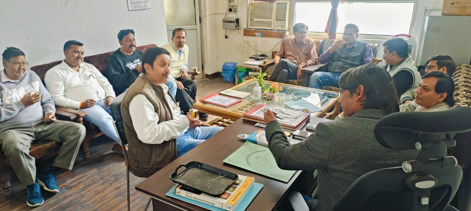 कार्यवाहक प्रमुख अधीक्षक डा आर बी सिंह कार्यवाहक मुख्य चिकित्सा अधीक्षक डा विकासदीप,डा शशिकान्त, डा सुब्रत अरोड़ा ,मुख्य प्रशासनिक अधिकारी श्री दिनेश धनोशी, स्थापना से श्रीमती सुनीता एवं कर्मचारी संगठन के प्रदेश अध्यक्ष दिनेश लखेडा, प्रवक्ता राजेन्द्र तेश्वर, ऑडिटर महेश कुमार, जिलामंत्री राकेश भँवर, मूलचंद चौधरी ,सतीश इत्यादि पदाधिकारियों की द्विपक्षीय वार्ता हुई जिसमें निम्न बिंदुओं पर सहमति बनी