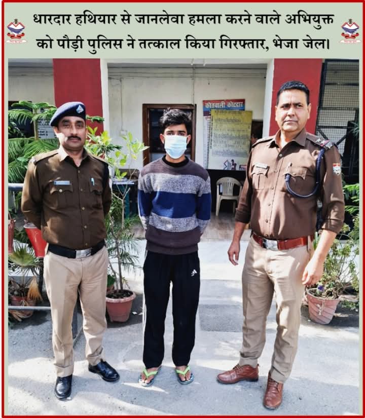 धारदार हथियार से जानलेवा_हमला करने वाले अभियुक्त को पौड़ी पुलिस ने तत्काल किया गिरफ्तार, भेजा_जेल।
