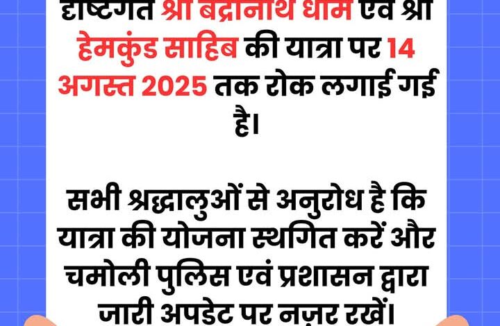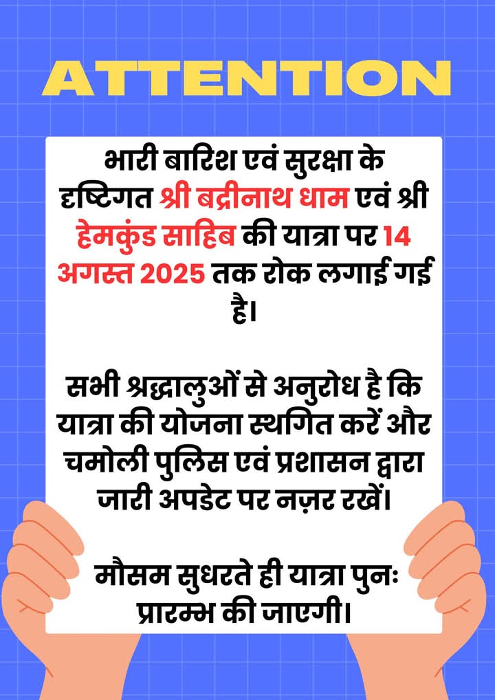 भारी वर्षा और सुरक्षा कारणों से श्री बद्रीनाथ धाम व श्री हेमकुंड साहिब की यात्रा पर 14 अगस्त 2025 तक अस्थायी रोक।