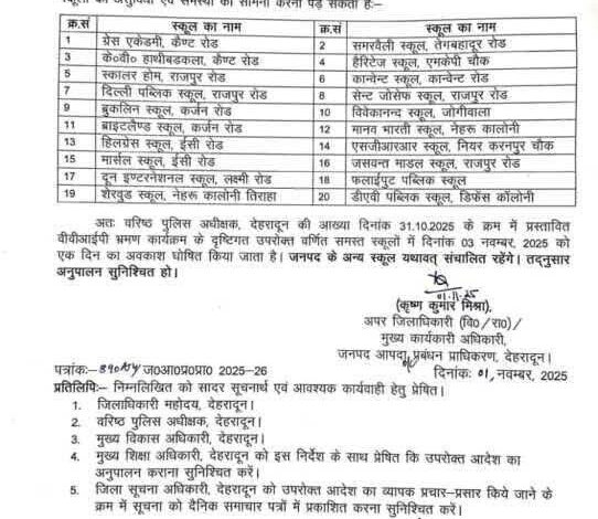 आगामी 3 नवम्बर 2025 को देहरादून में राष्ट्रपति के भ्रमण के मद्देनजर शहर में स्थित इन स्कूलों में जिला प्रशासन ने अवकाश घोषित किया है।